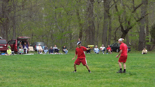 For more than 30 years friends of mine have organized a frisbee tournament here in Fredericksburg. It started when they all attended Mary Washington College here. 4 events are held over two days (golf, distance, maximum time aloft and freestyle) with an overall winner declared at the end as well as individual winners. I've been making trophies for most of those years. It is all sponsored by 'Laszlo's Weenie World', a loose consortium of good hearted people who work most of the year to provide delicious food (all vegetarian!) and entertainment and what we call 'goof factor' for a couple of hundred people. Competitors come from all over the US and, just like the pottery world, there are a lot of gray haired folks about! I got to visit for a couple of hours this afternoon and see the finals of the freestyle. It is a great scene.